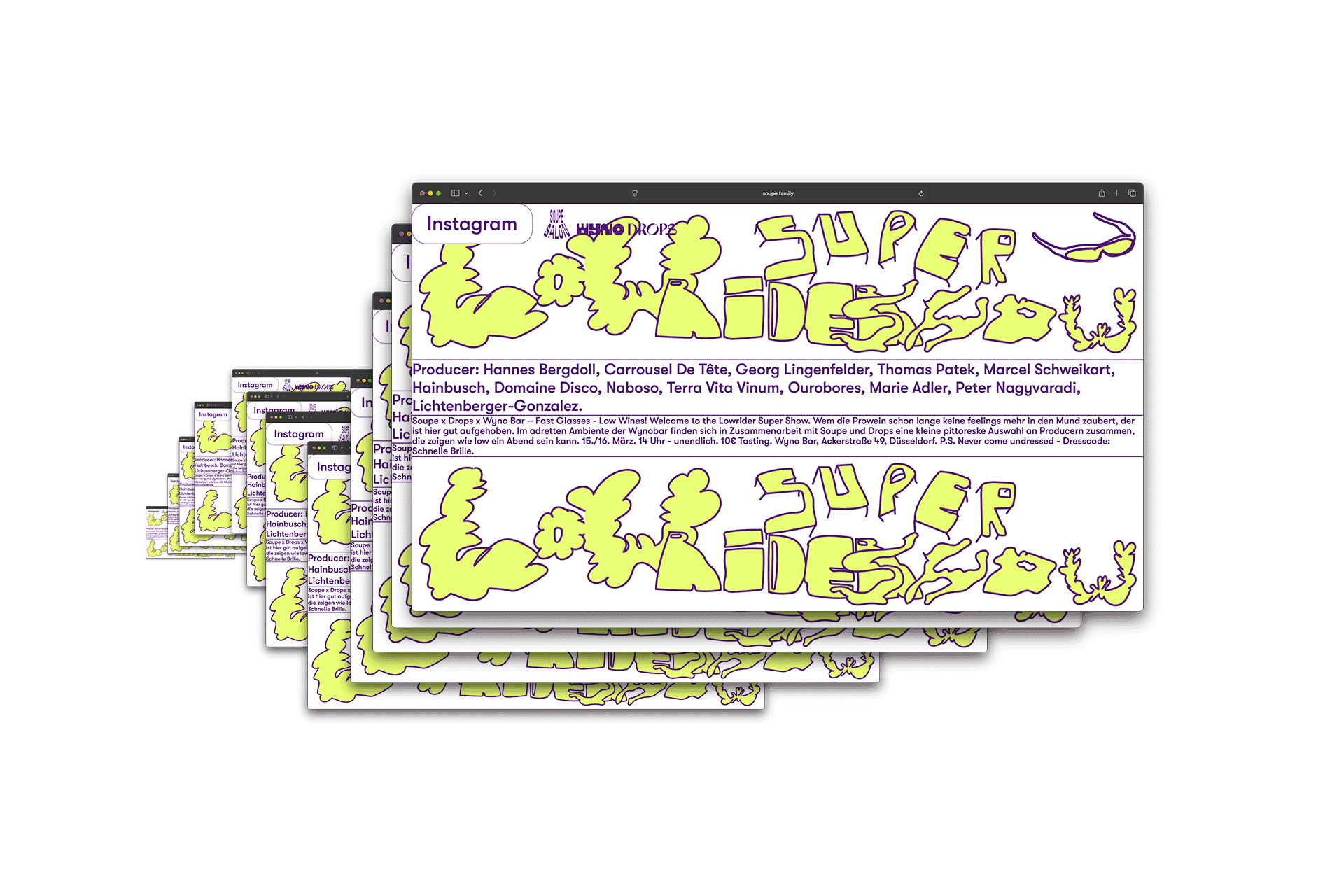 Soupe oder besser Soupe Salon, ist unser kleiner Beitrag für die schöne Vino Culture von heute. Von uns ins leben gerufen ist Soupe mit vielen tollen Freunden zu einem Ort gereift an dem sich allerlei schöne Menschen mit Interesse an Low Intervention Weinen zusammenfinden. Vom Branding über Kommunikation, Eventplanung ist Soupe unser interessantestes Eisen ins Sachen Vino.
